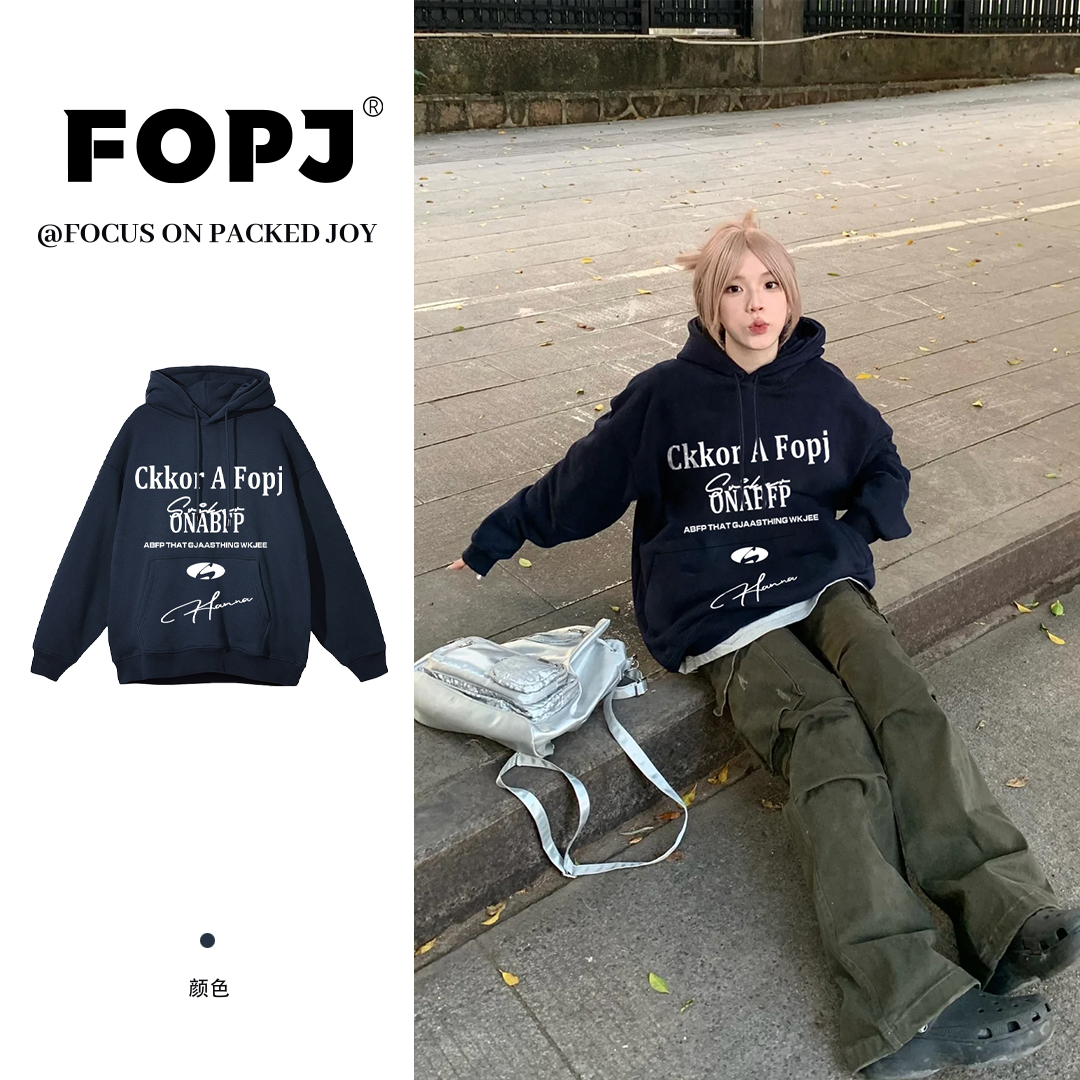 FOPJ美式时尚潮流印花连帽衫卫衣女学生春秋宽松加绒加厚减龄外套
