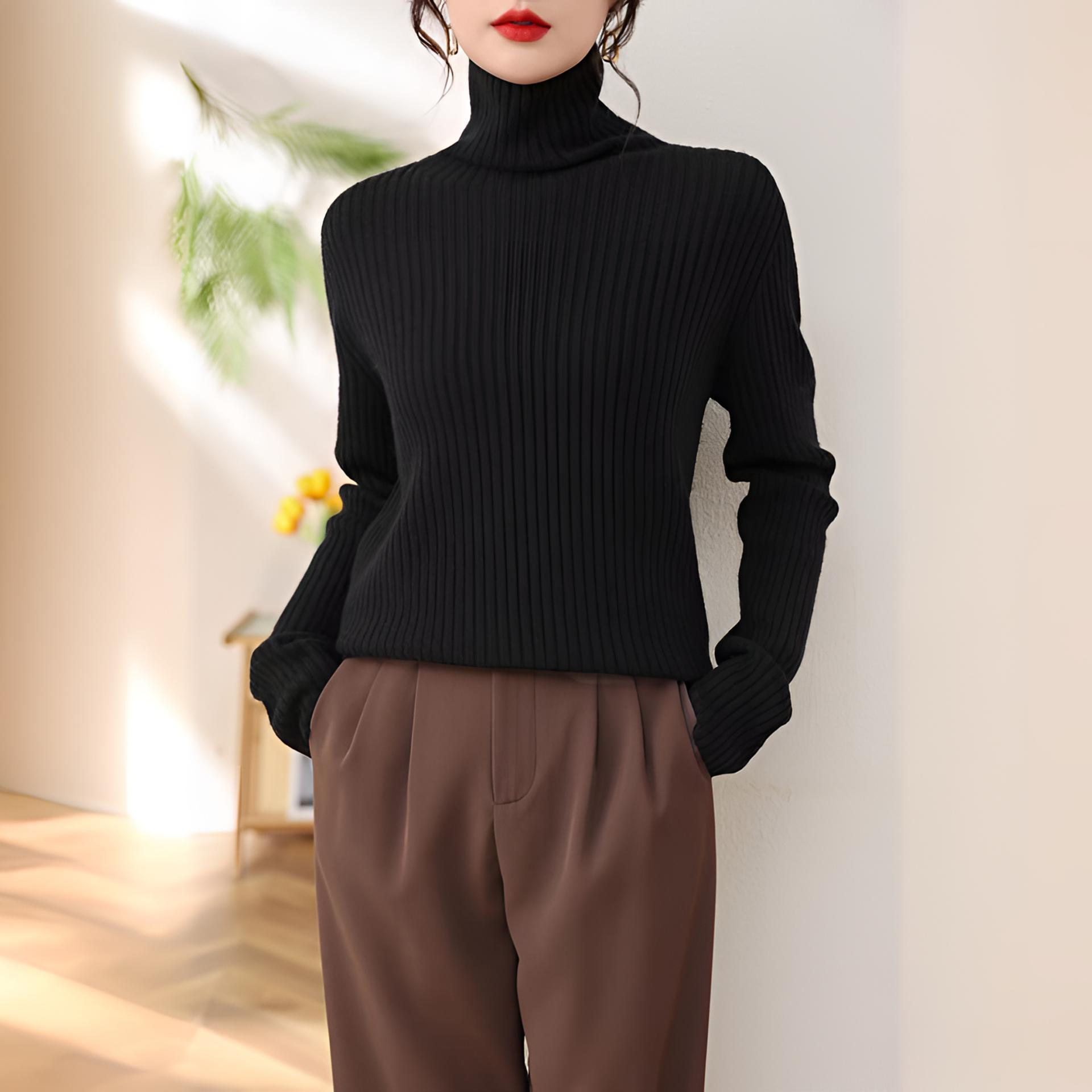 秋冬新款100%羊毛抽条高领套头针织打底毛衣纯色宽松内搭羊毛衫女