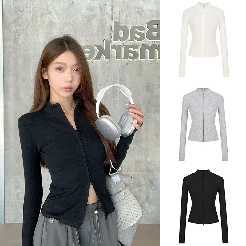 Moses Queen/魔西女王双拉链立领针织开衫女春秋百搭外套修身上衣
