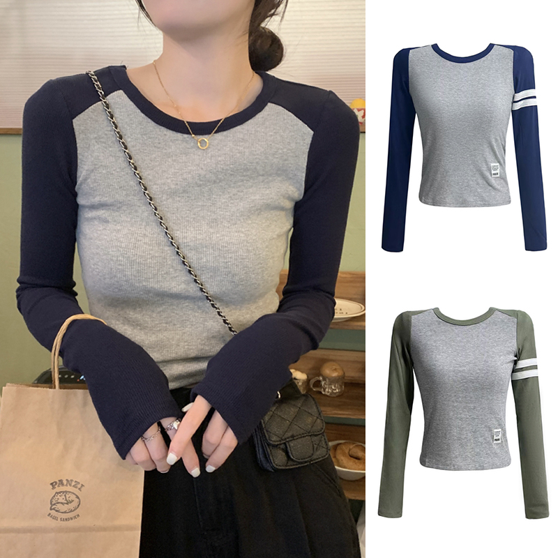 撞色春秋季新款学院风洋气拼接长袖正肩T恤女螺纹内搭打底衫上衣