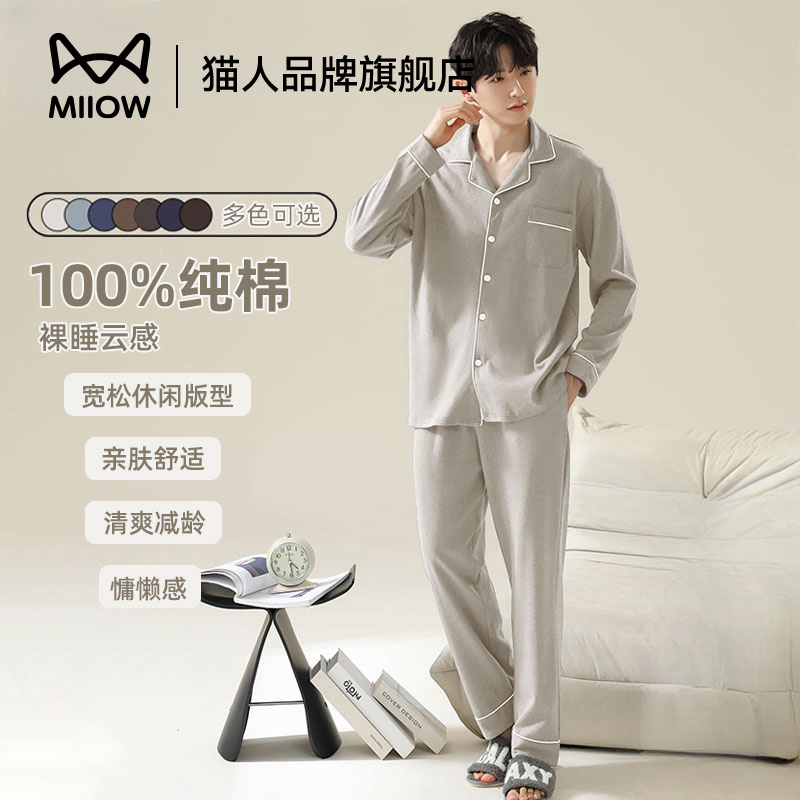 猫人纯棉睡衣男士春夏款开衫长袖新款全棉大码舒适透气家居服套装