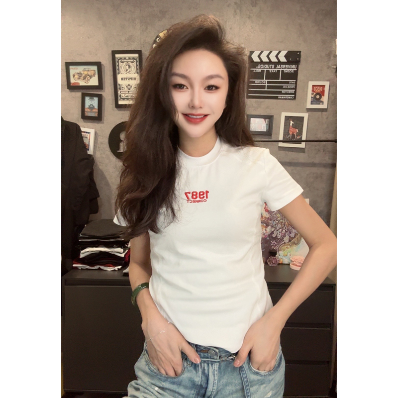 1987数字刺绣高弹力精梳棉短袖T恤女修身显瘦透气轻肤插肩袖上衣