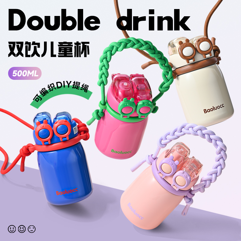 潮流可爱儿童保温杯小学生便携防漏防摔外带吸管直饮杯斜挎水杯子