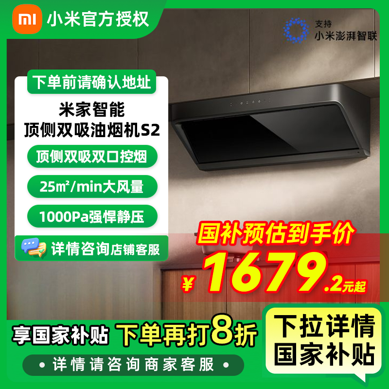 【国家补贴】小米米家智能顶侧双吸油烟机S2 25大吸力升降平齐橱柜