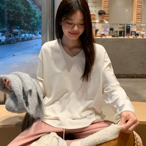 秋季v领斜肩白色打底衫慵懒弹力百搭上衣宽松中长款长袖t恤女罩衫