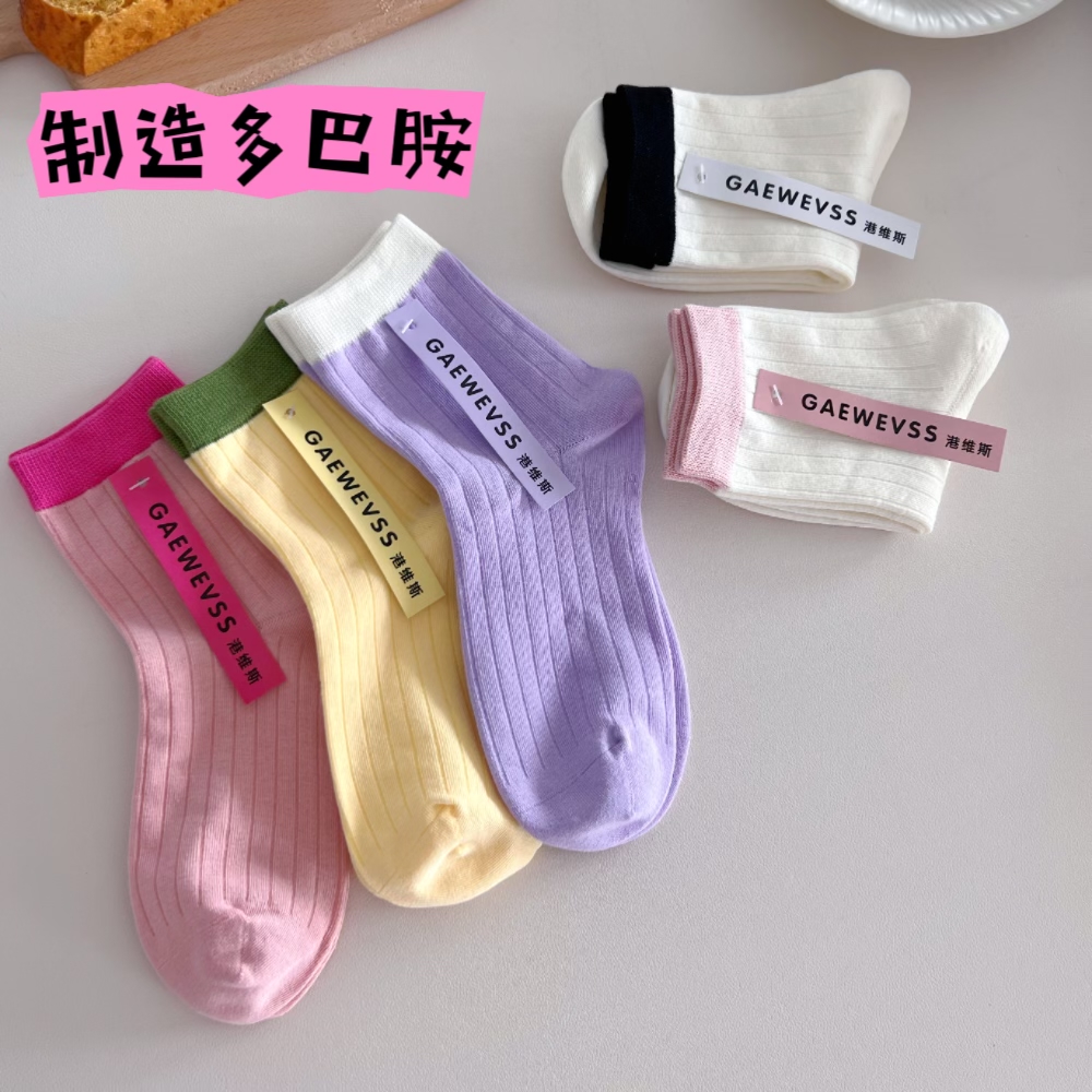 【港维斯】一口奶油~拼色棉袜春夏纯色彩色拼接短袜 日常简约女袜