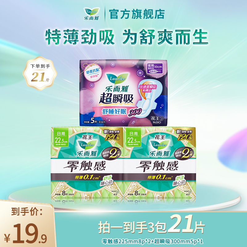【专享1】花王乐而雅零触感+超瞬吸透气日夜组合卫生巾3包21片