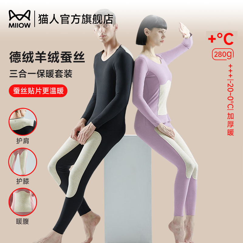 猫人【加厚暖】德绒锁温贴片无痕双面绒紧身加绒保暖男士女士套装
