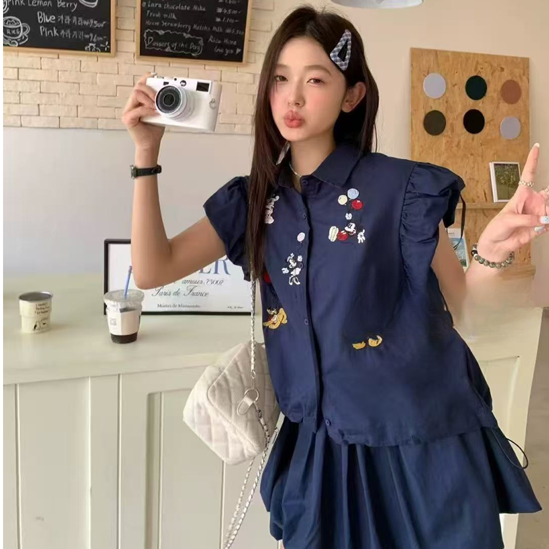 大码胖MM时尚套装夏季卡通刺绣衬衫花苞裙套装脏脏风工装风