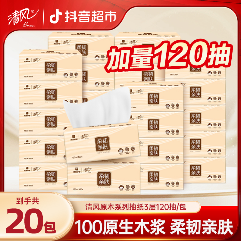 清风抽纸原木纯品120抽×20包无香家用三层加厚纸巾卫生纸囤货装