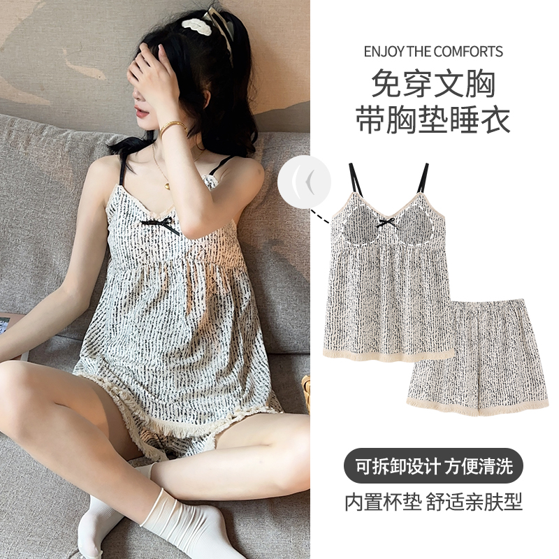 清冷感斑马纹睡衣女士夏季薄款带胸垫吊带短裤套装夏天休闲家居服
