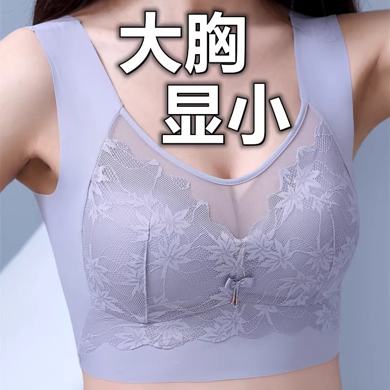 大胸显小大码文胸无钢圈蕾丝美背心式一体无痕内衣女冰丝薄款胸罩