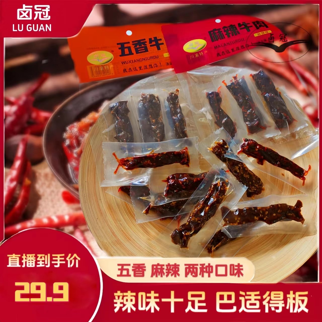【卤冠旗舰店】四川特色五香麻辣牛肉80g*3袋真空包装追剧休闲零食