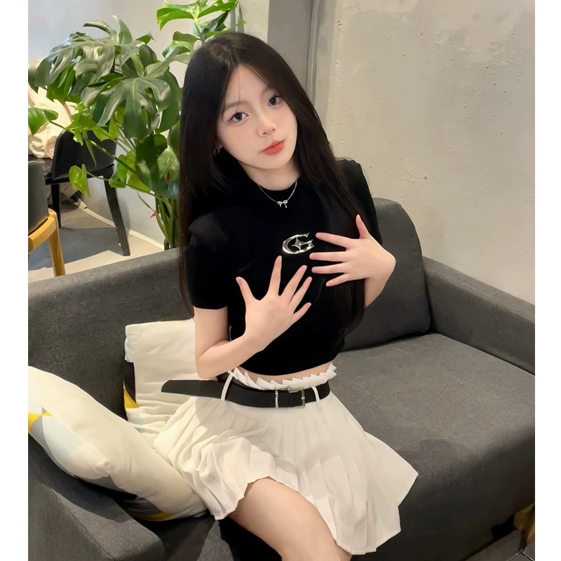 CST黑色正肩短袖t恤女夏季短款甜辣妹修身设计感小众chic港味上衣