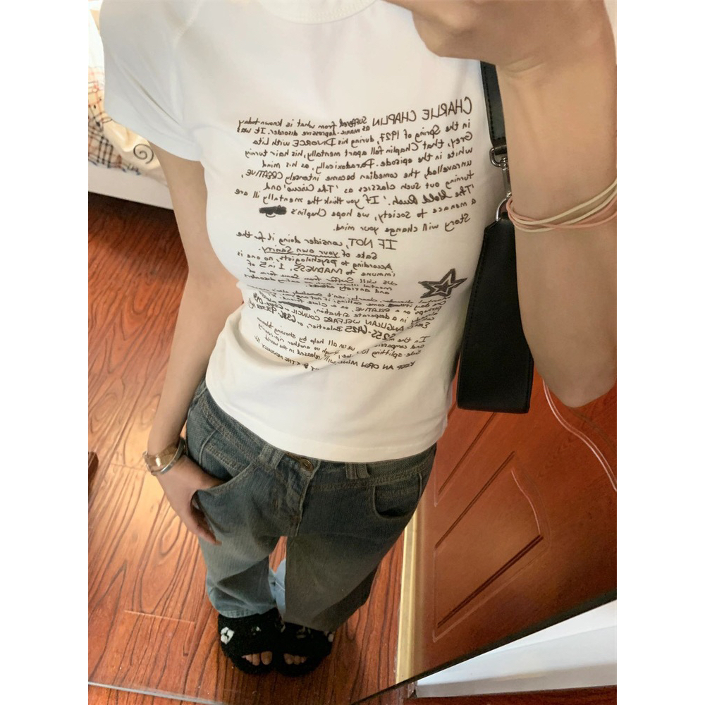 CST美式圆领正肩短袖t恤女夏季新款小众字母印花复古修身辣妹上衣