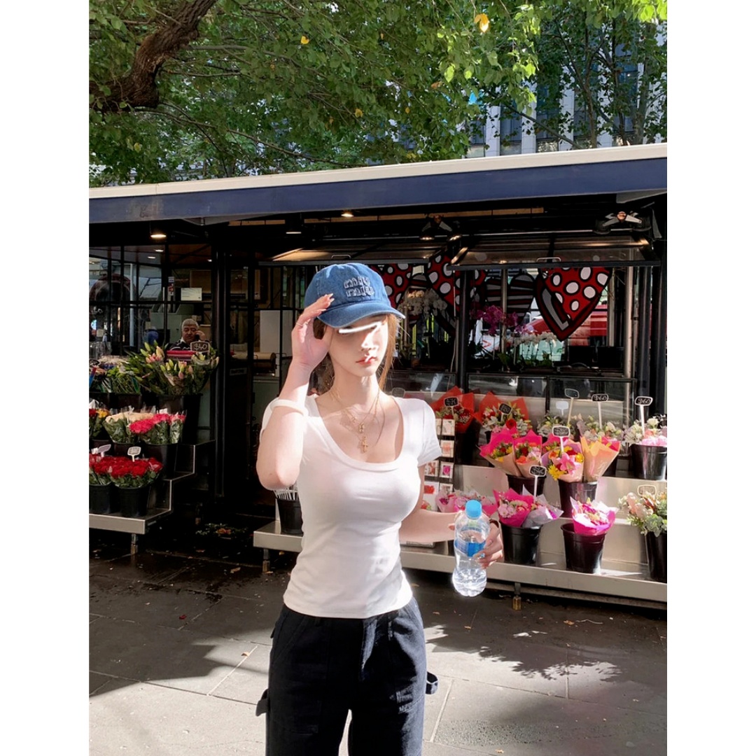 白色短袖修身收腰u领甜辣小上衣女夏季2025新款小个子辣妹正肩t恤