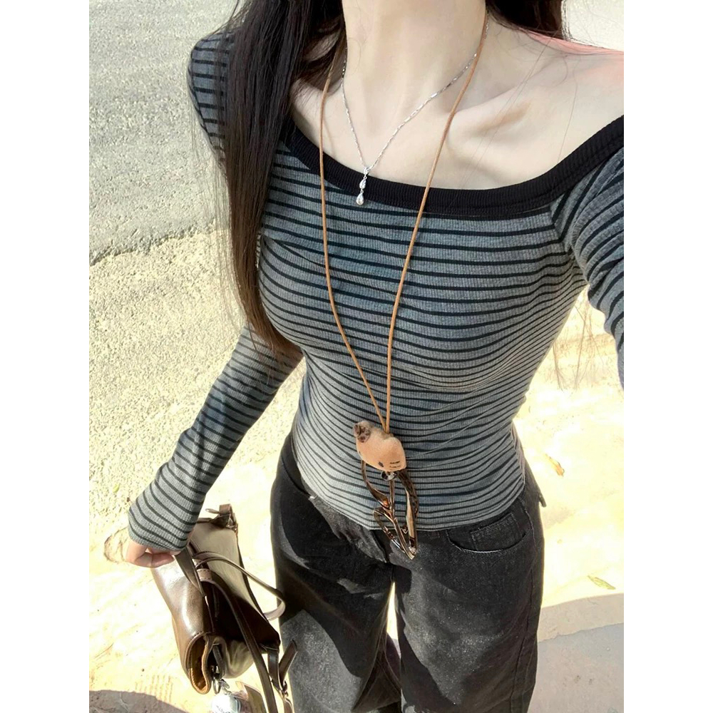 一字领斜肩条纹长袖t恤女秋季内搭打底衫辣妹别致修身短款小上衣