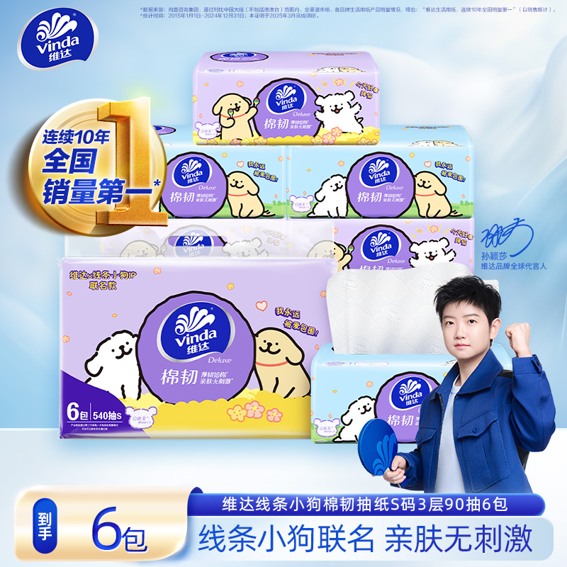 维达线条小狗棉韧抽纸3层90抽6包/提压花亲肤-DT