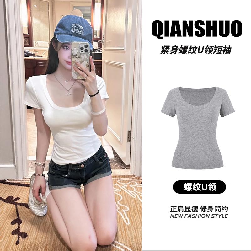 千朔夏季新款大U领正肩短袖T恤女修身收腰基础款纯色辣妹短款上衣