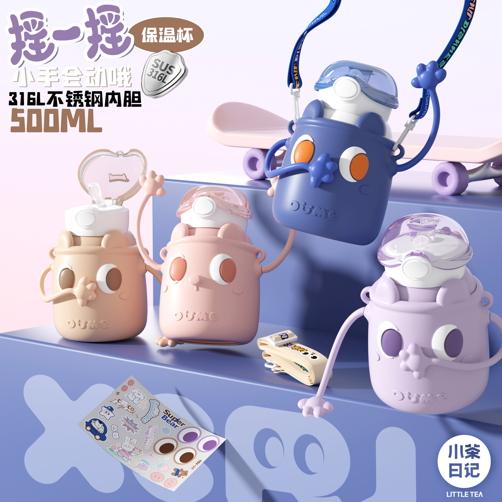 小茶日记摇一摇500ml保温杯316大容量学生可爱水杯子创意吸管杯DB