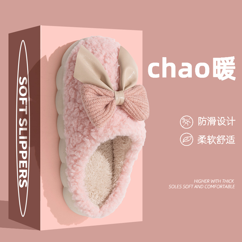 蝴蝶结踩屎感棉拖鞋女秋冬季厚底室内舒适轻便毛绒保暖毛鞋居家