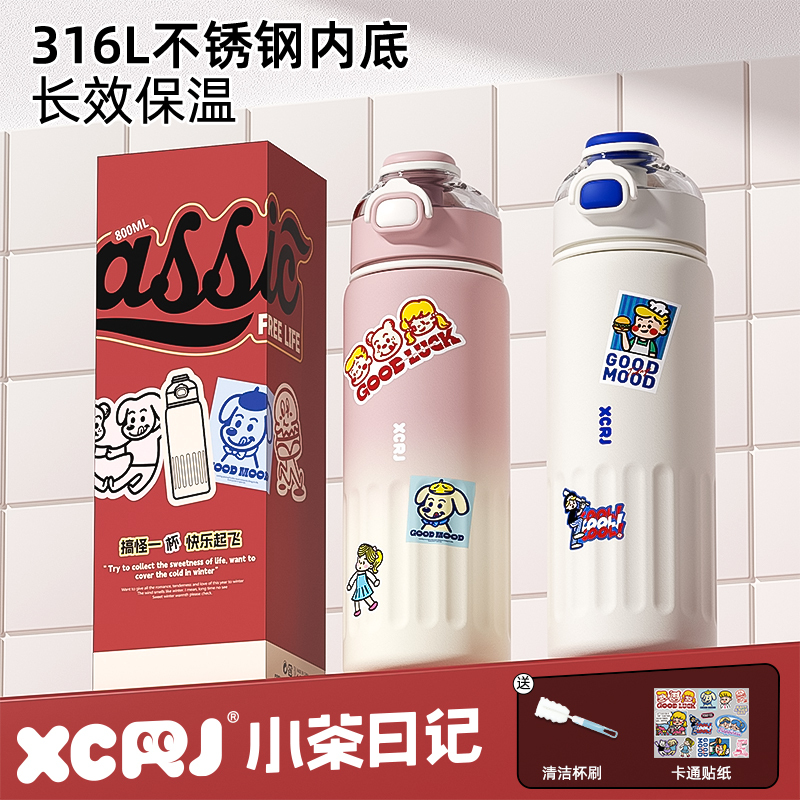 小茶日记敲有趣800ml学生上学大容量加厚时尚高颜值保冷保温杯GF