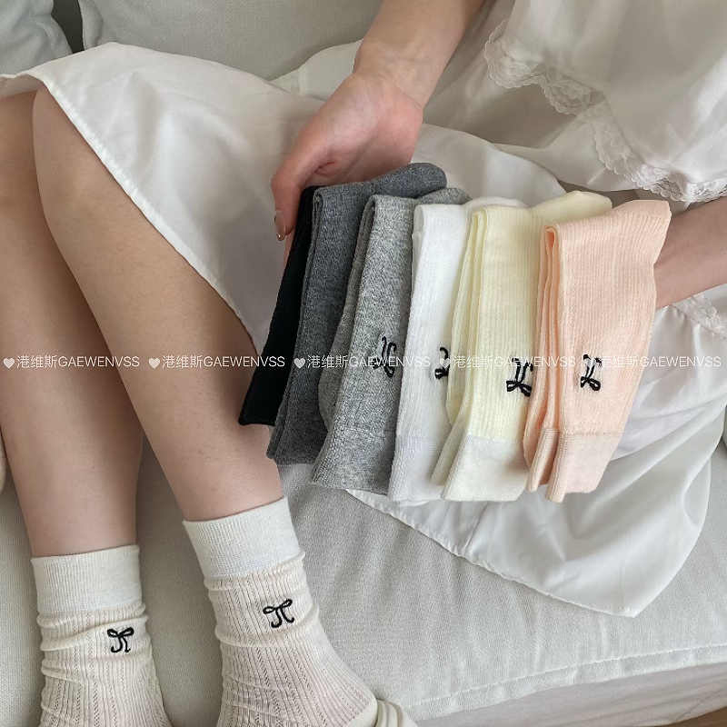港维斯韩系芭蕾风透气简约白色蝴蝶结中筒袜夏季薄款温柔仙女袜