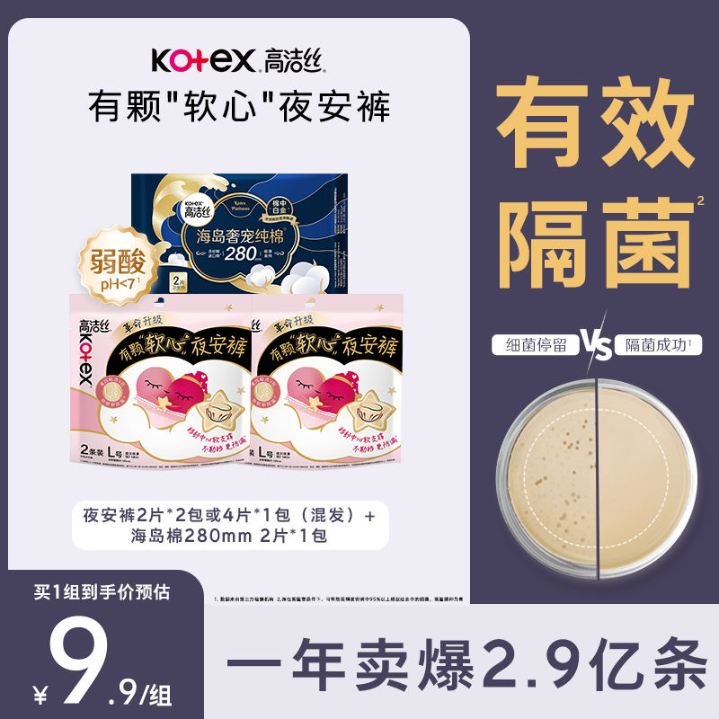 高洁丝有颗“软心”夜安裤安睡裤超薄防漏共4条+岛棉280mm2片*1包