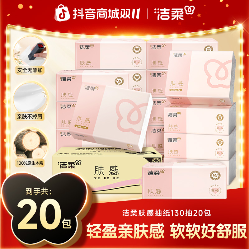 【大容量130抽】洁柔抽纸肤感130抽20包家用纸可湿水亲肤双11好物C