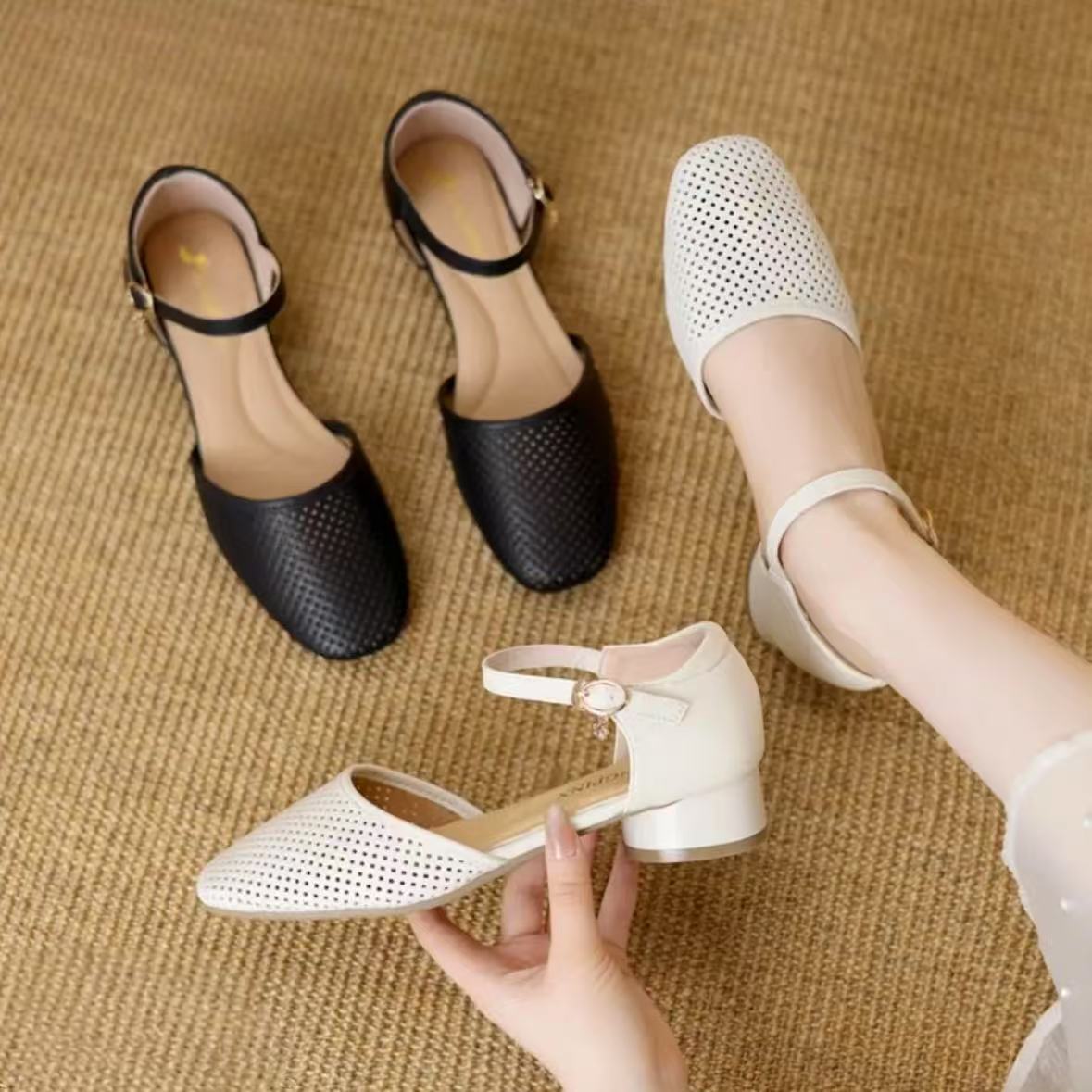 【品牌力荐】法式一字扣女鞋夏季真皮洞洞中空单鞋低跟包头8637