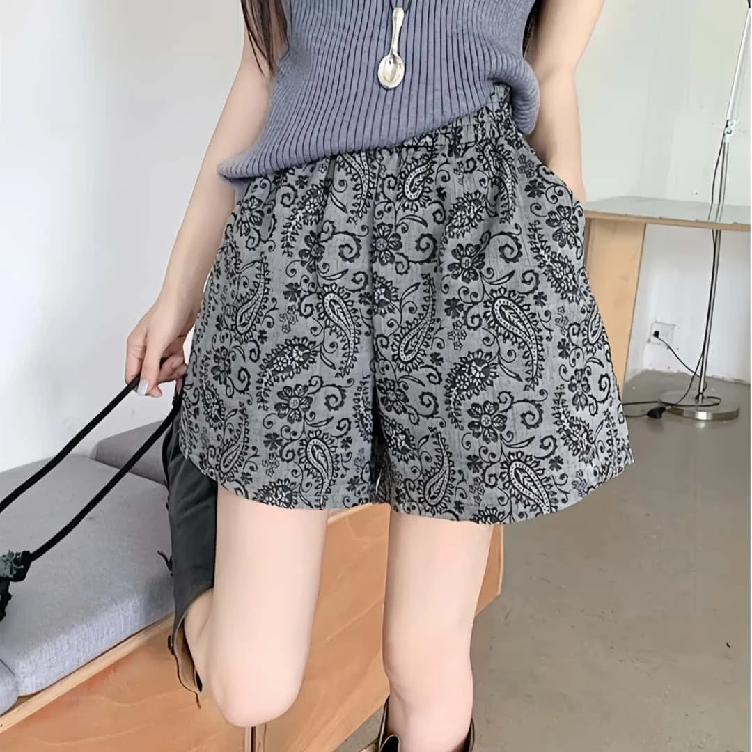 大码复古设计感休闲裤女装夏季时尚高腰阔腿裤胖MM遮肉显瘦短裤子