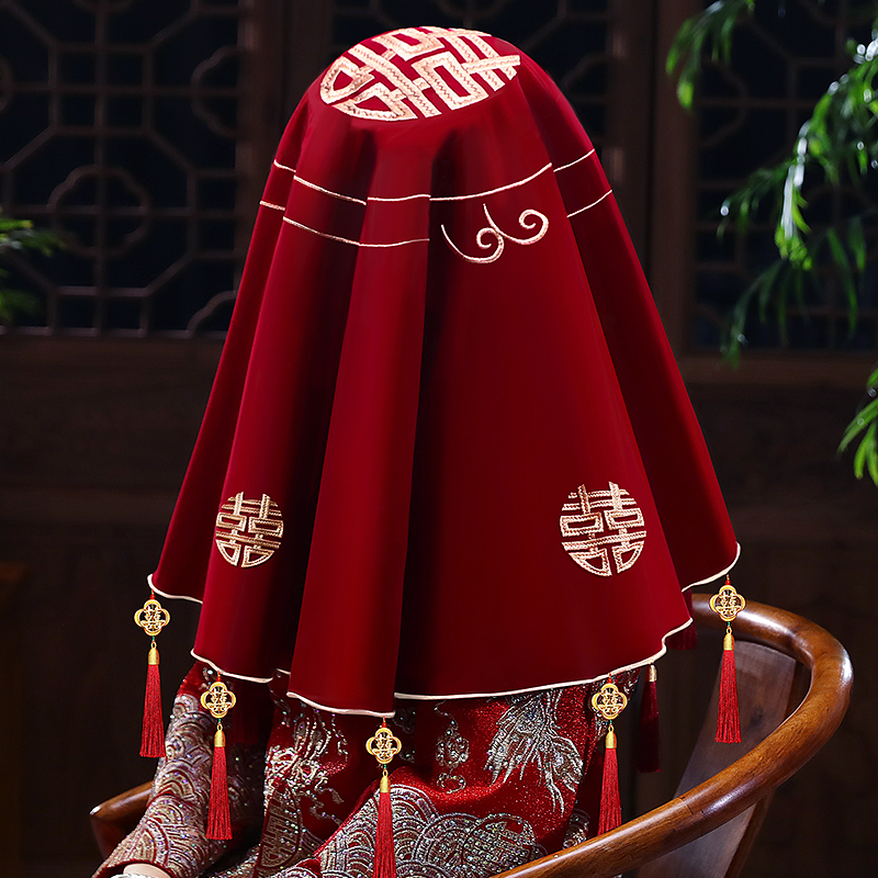红盖头纱巾新款结婚陪嫁用品高档缎面中式新娘秀禾服头巾婚庆用品