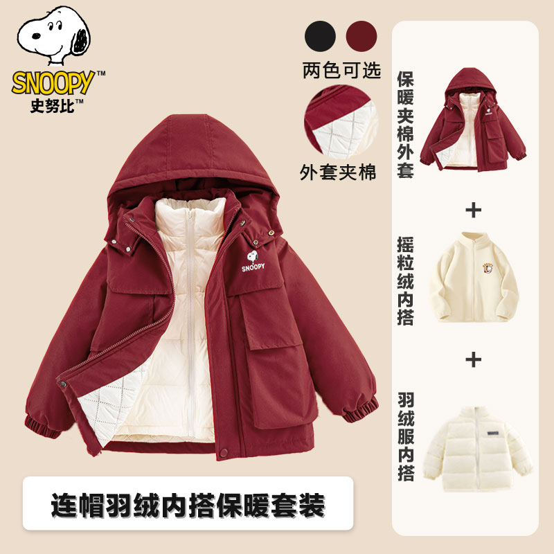 史努比儿童棉服摇粒绒羽绒内胆三合一外套三件套冬季保暖组合装