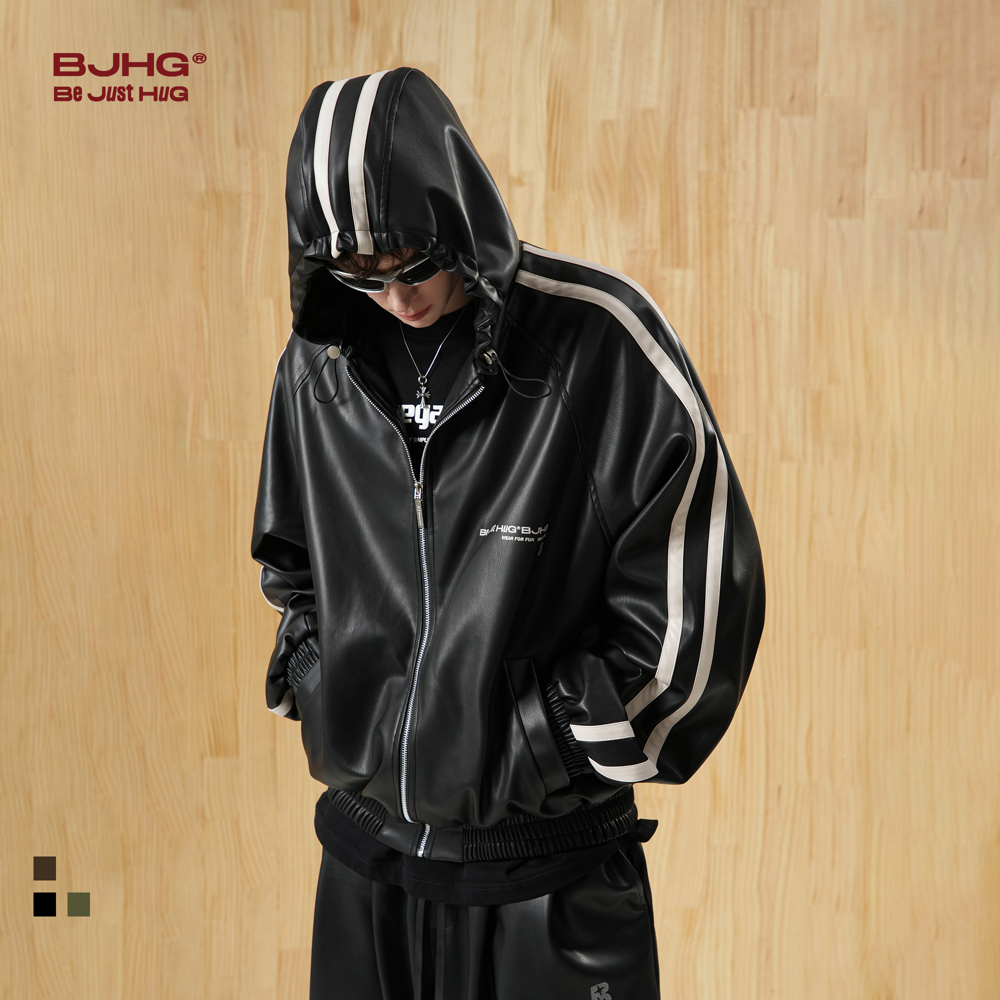 【专属】BJHG撞色拼条PU皮秋季外套男潮vintage美式连帽运动夹克