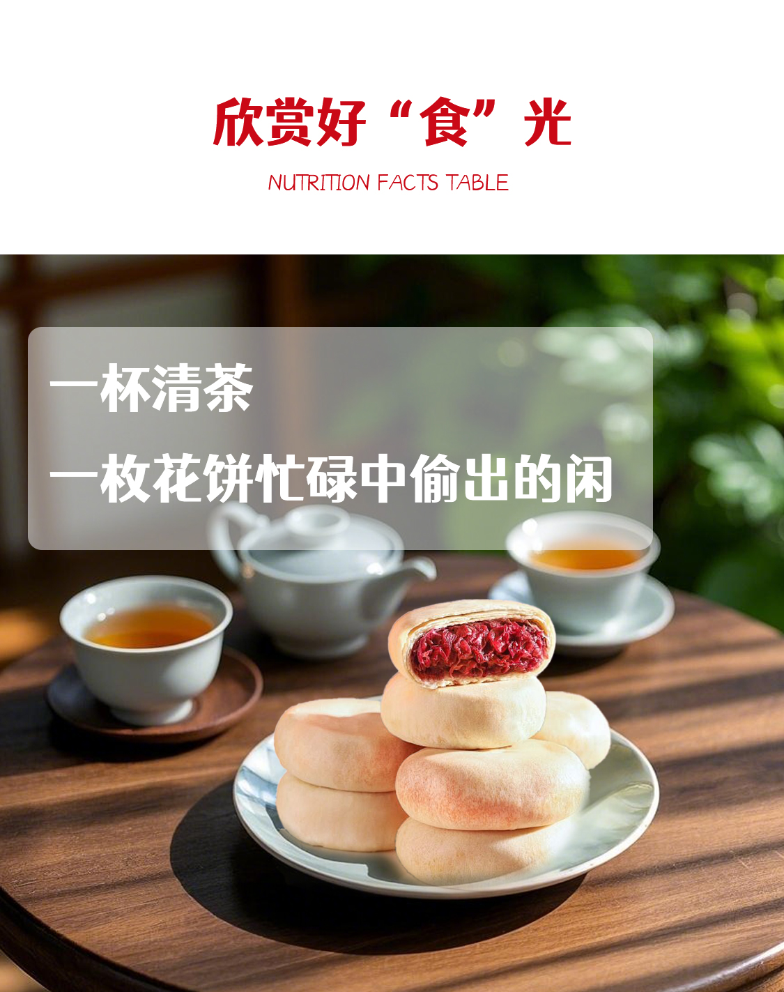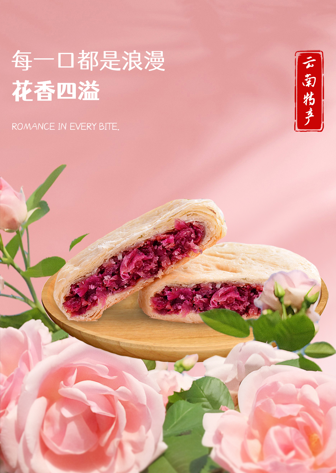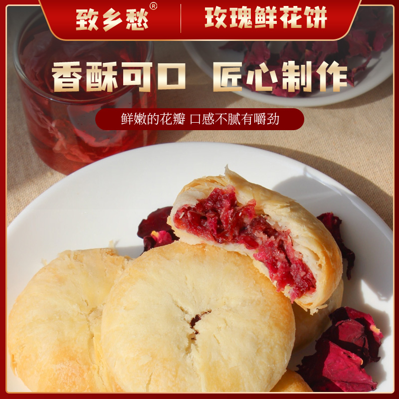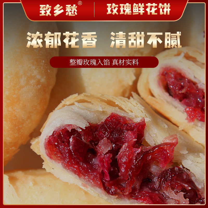 玫瑰鲜花饼 层层酥香 清甜软糯;均衡皮馅比 均衡皮馅比,一口咬下去同时能咬到酥皮和花馅,清甜刚刚好。层层酥皮 清甜美味 层层酥香,清香怡人幸福满满~