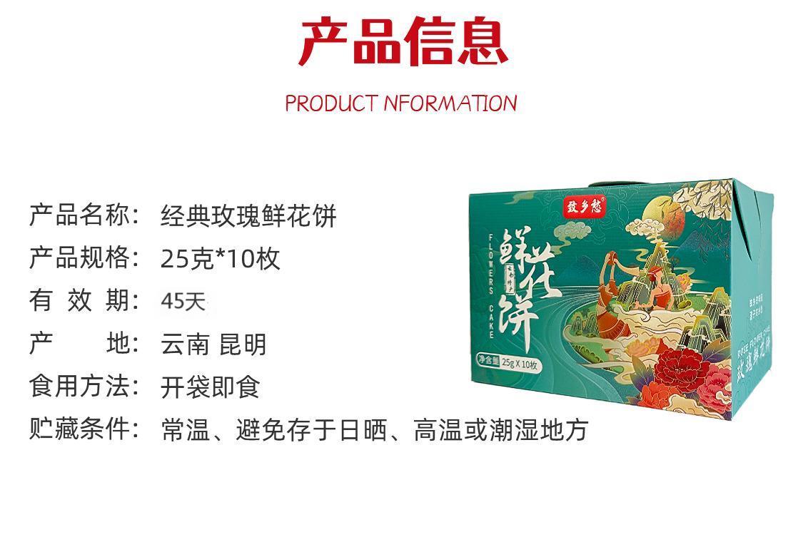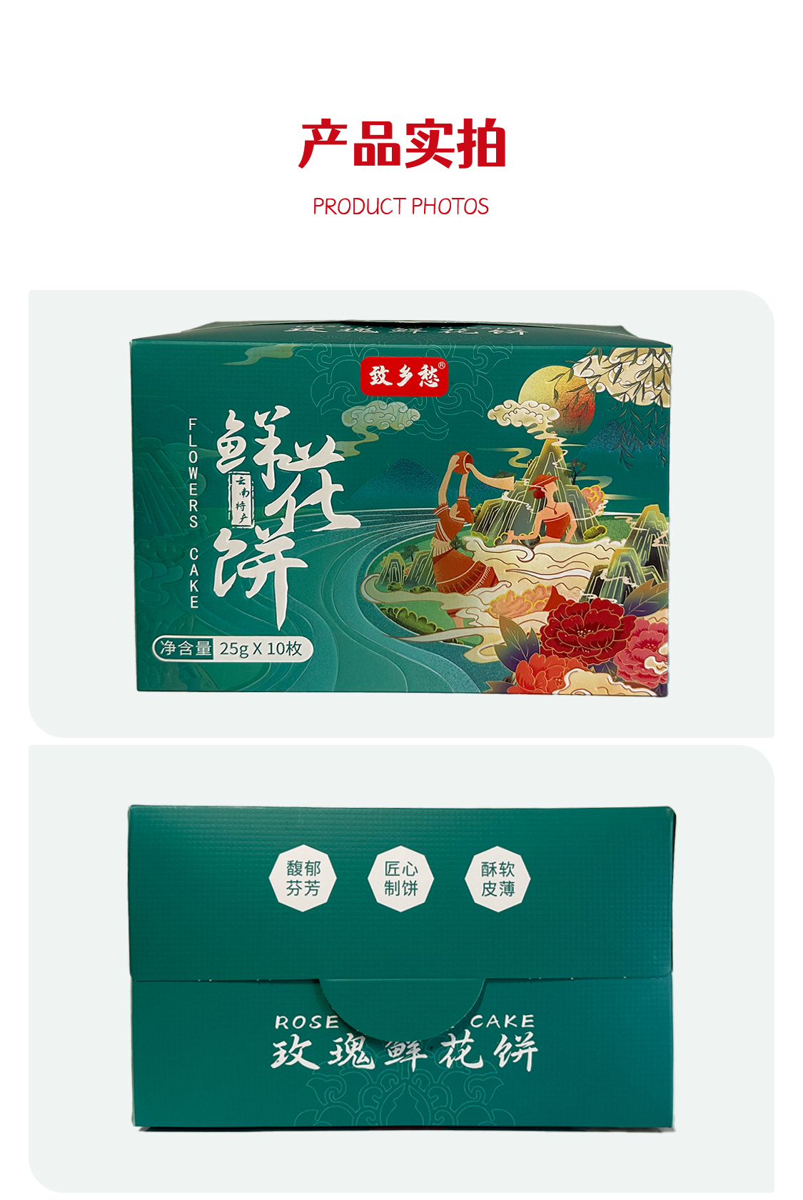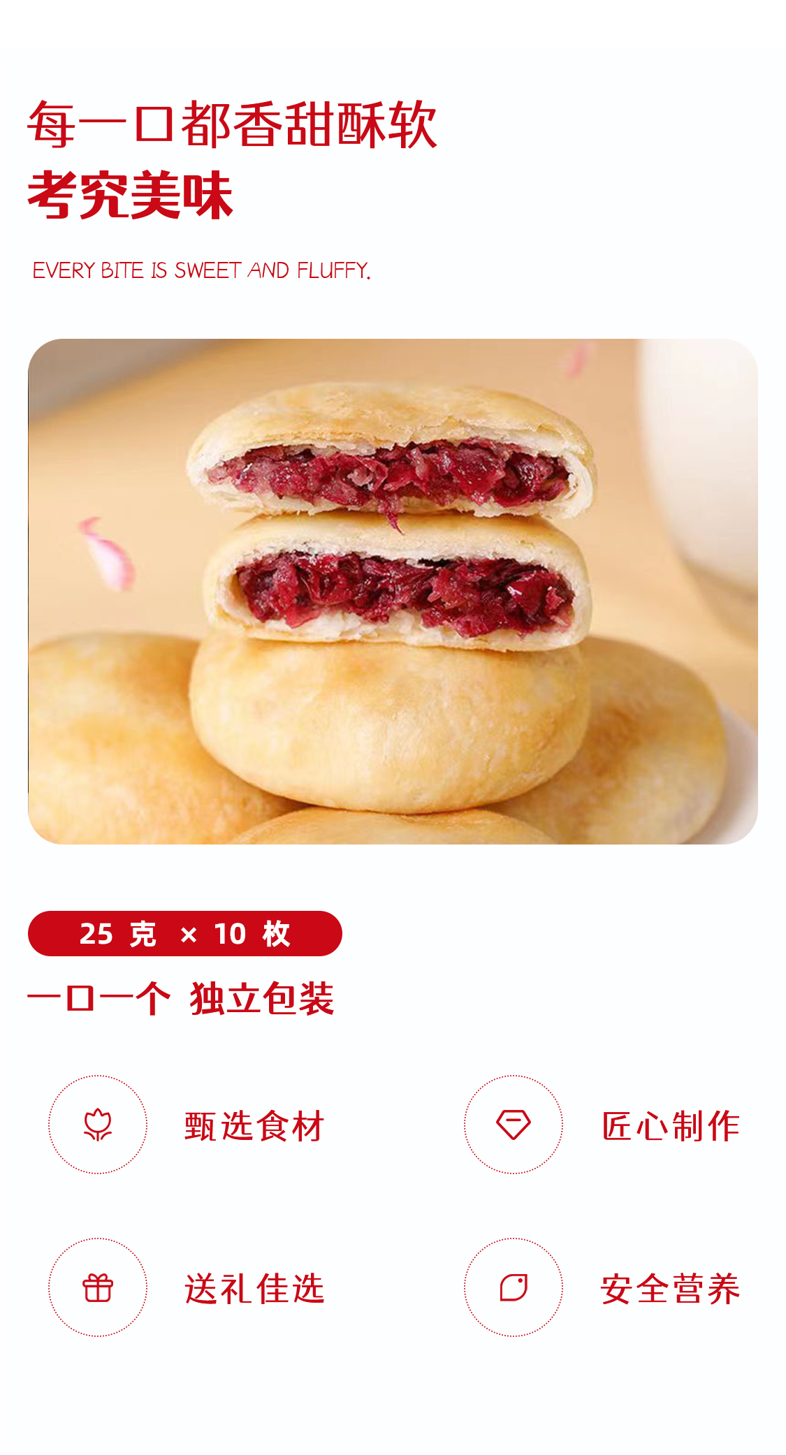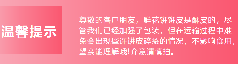 玫瑰鲜花饼 层层酥香 清甜软糯;均衡皮馅比 均衡皮馅比,一口咬下去同时能咬到酥皮和花馅,清甜刚刚好。层层酥皮 清甜美味 层层酥香,清香怡人幸福满满~