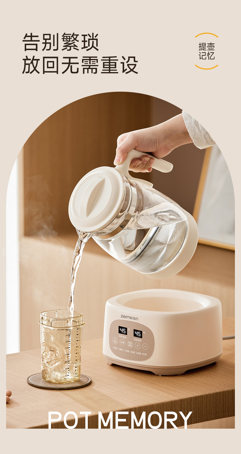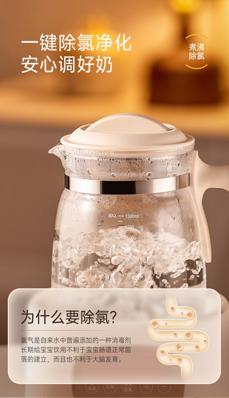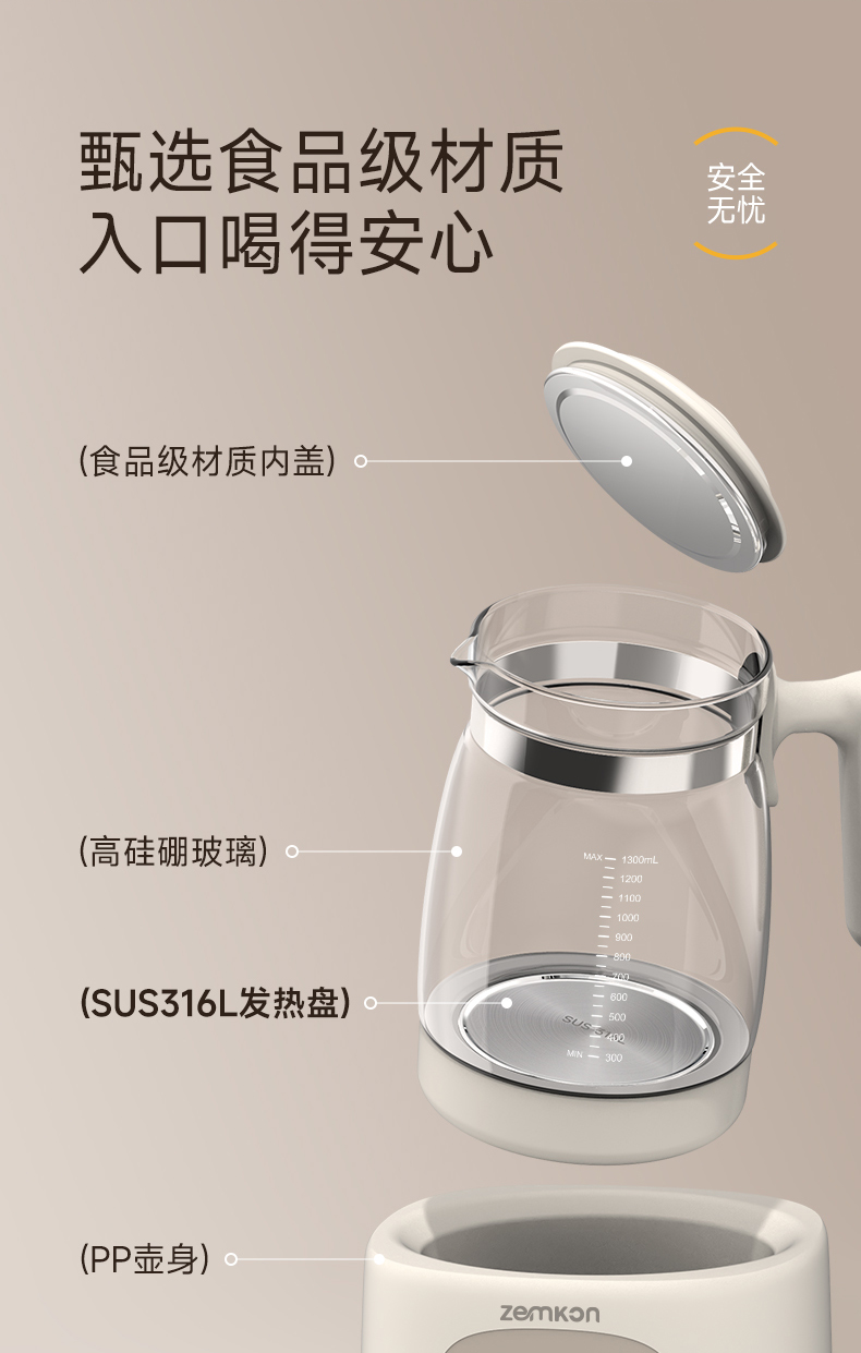 一机多能,全玻璃、无水垢、无胶味,1.3升大容量,一次可煮5杯鲜活水,