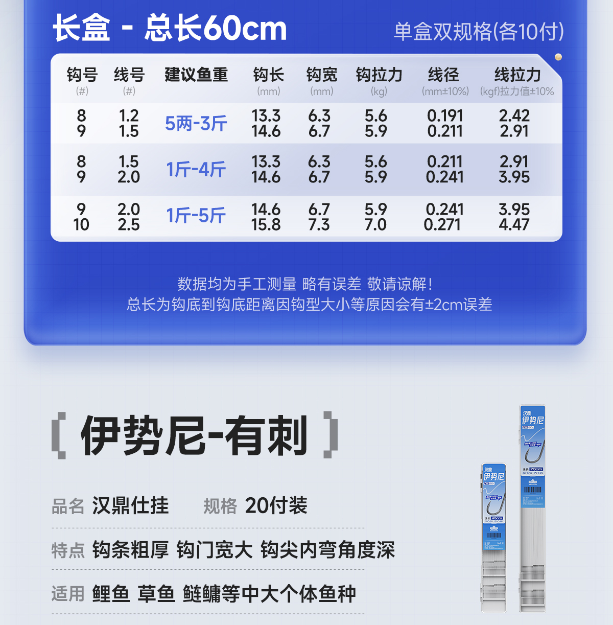 - ¥17.90【钩1线0.6+钩2线0.8】45cm伊势尼有刺(20付)