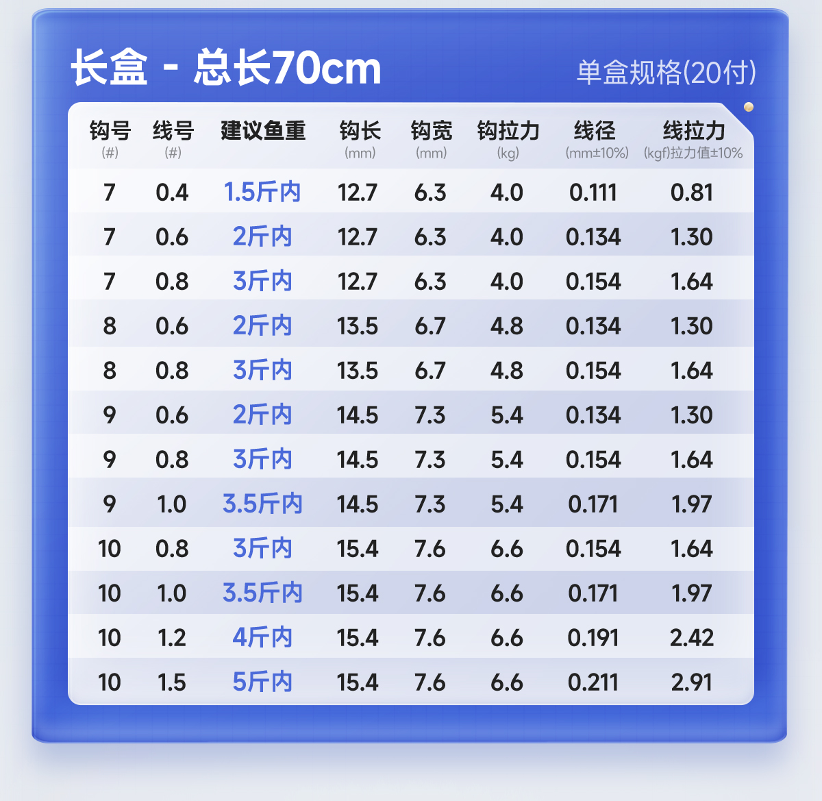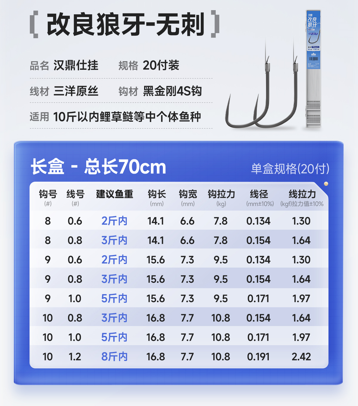- ¥20.80【钩9线0.8】70cm改良狼牙(20付)鱼重3斤内