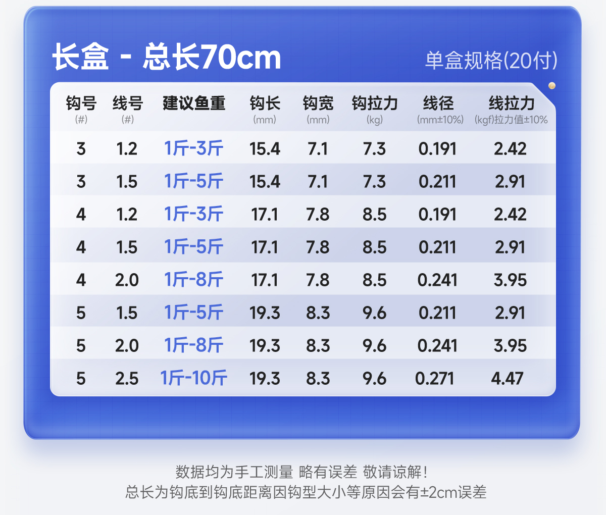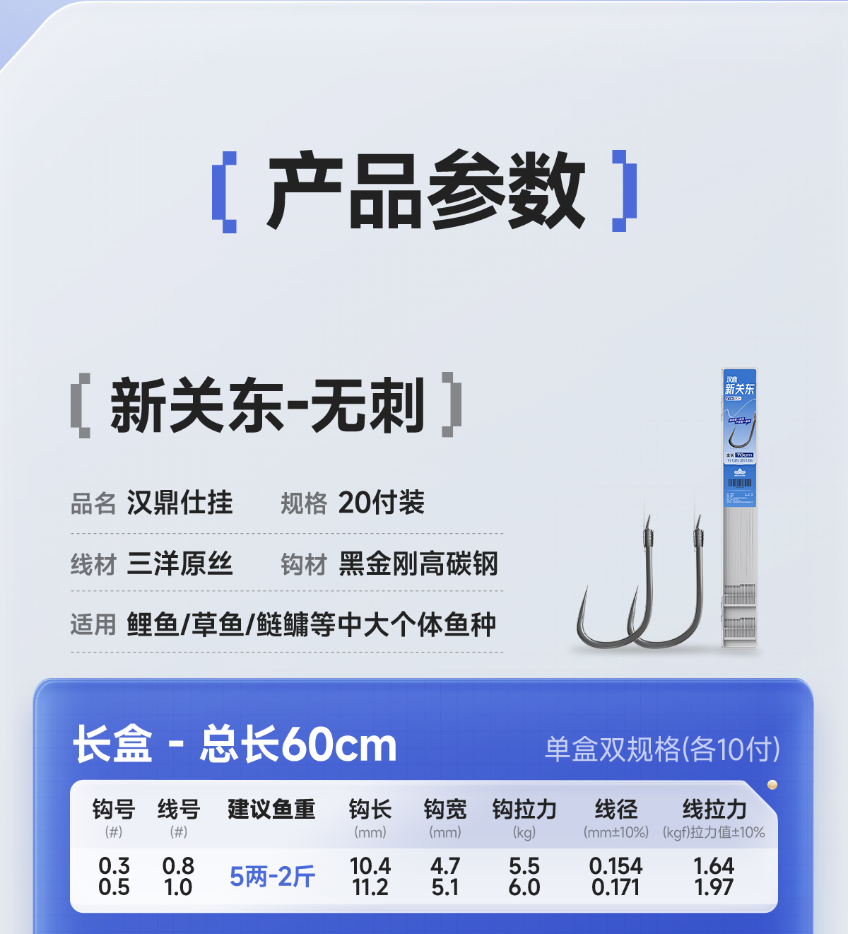 - ¥17.90【钩0.3线0.8+钩0.5线1.0】60cm新关东(20付)鱼重5两-2斤