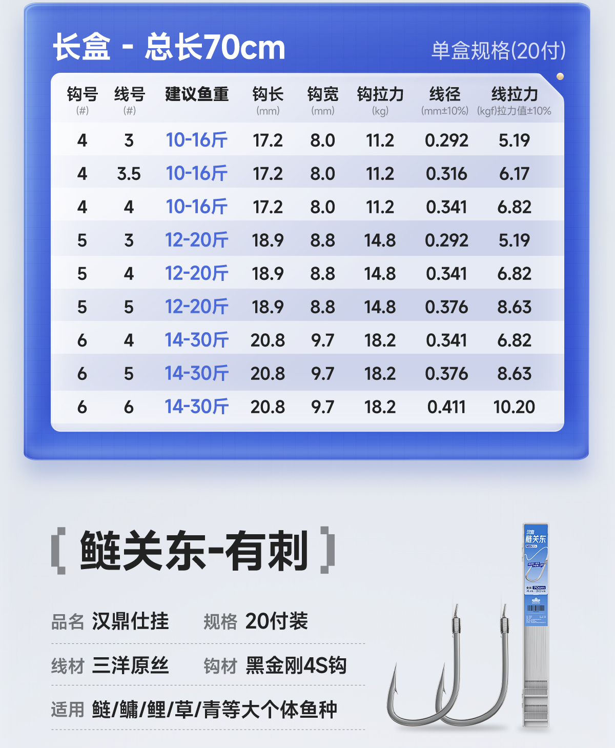 - ¥20.80【钩4线3】70cm鲢关东无刺(20付)