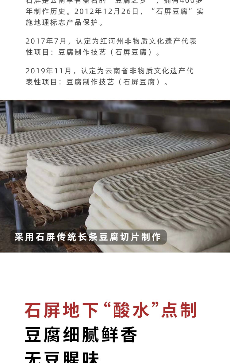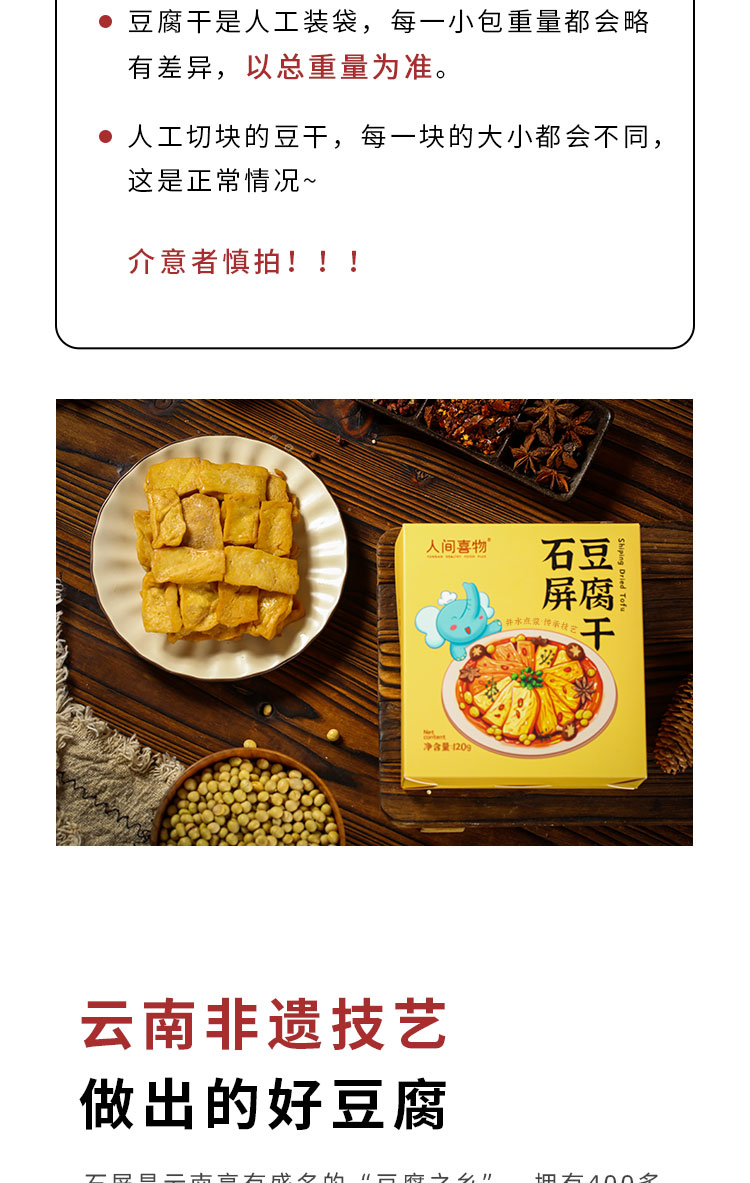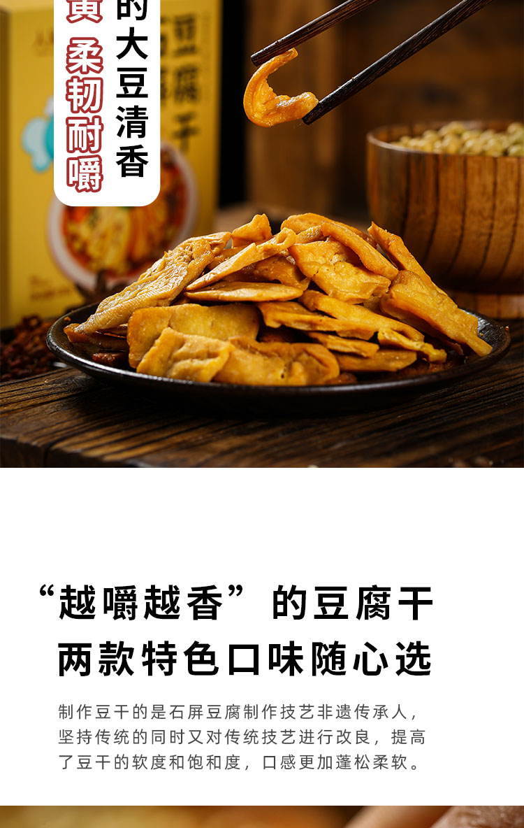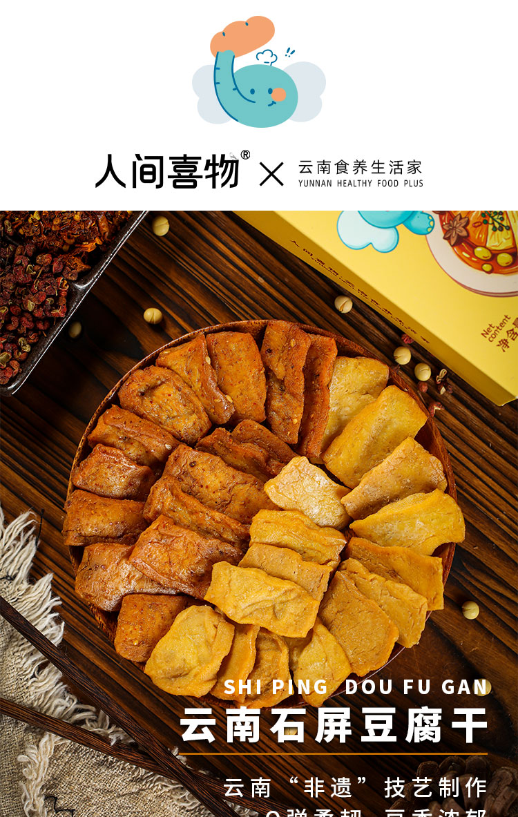 自从尝试了这款【人间喜物云南石屏豆腐干】,就完全被它的美味征服了!首先说说原味的吧,打开包装那一刻,就能闻到一股纯正的豆香,吃起来口感蓬松柔软,又不失嚼劲,真的做到了素食也能如此美味,让人回味无穷。作为休闲零食,它健康又解馋,非常适合下午茶时间或是追剧时享用。