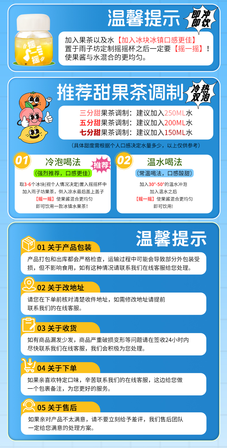 冲泡方法非常简单,按照说明操作即可,我一般都会在冲泡后摇一摇杯子,这样口感会更好。当然,甜度也是可以自己调整的,如果你喜欢甜一点,可以多加一点糖,如果你喜欢淡一点,那就少加一点。总的来说,这款果茶真的是非常方便,而且口感非常好。