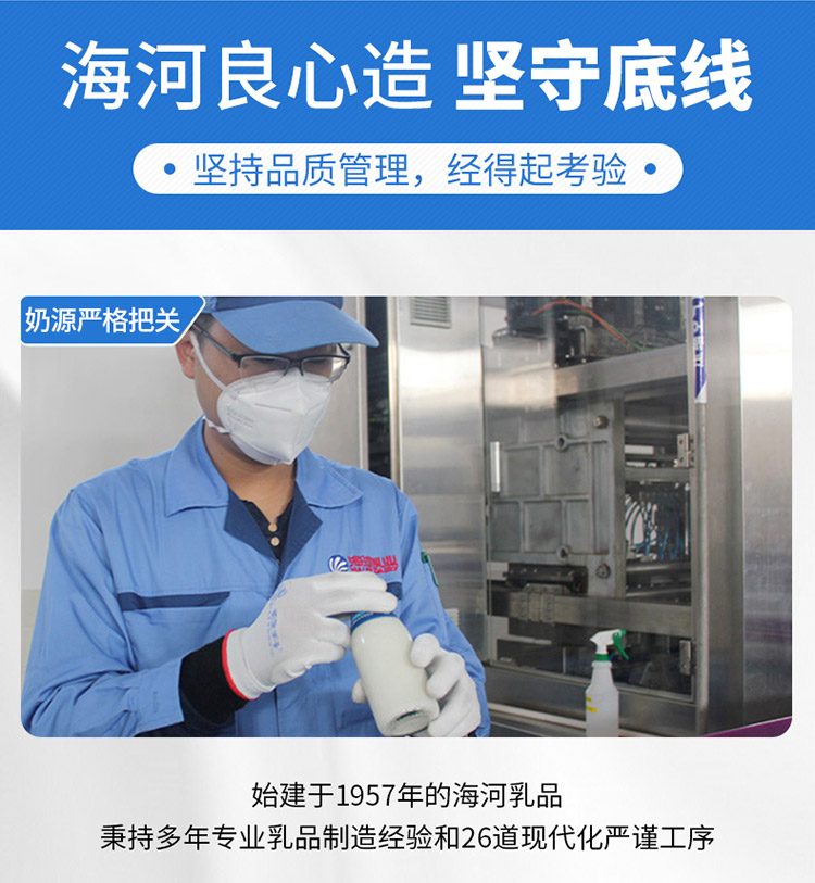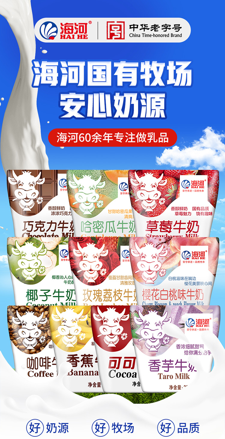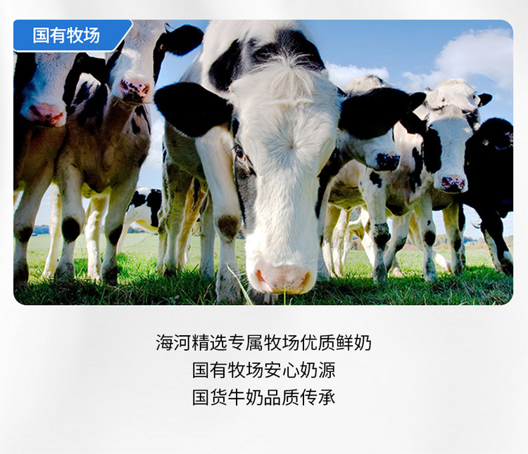 海河乳业目前拥有26个现代化国营养牛场共4万头 纯种荷斯坦 奶牛的奶源支持,从原奶上保证了国内一流水平,同时在天津静海等地建立了苜蓿等优质牧草种植基地。公司的各奶源基地全部实行封闭式饲养及机械化挤乳,均荣获绿色食品或无公害奶源基地认证及国标质量管理体系认证,独特的绿色、无公害奶源优势 , 实为中国乳业中之骄骄者。