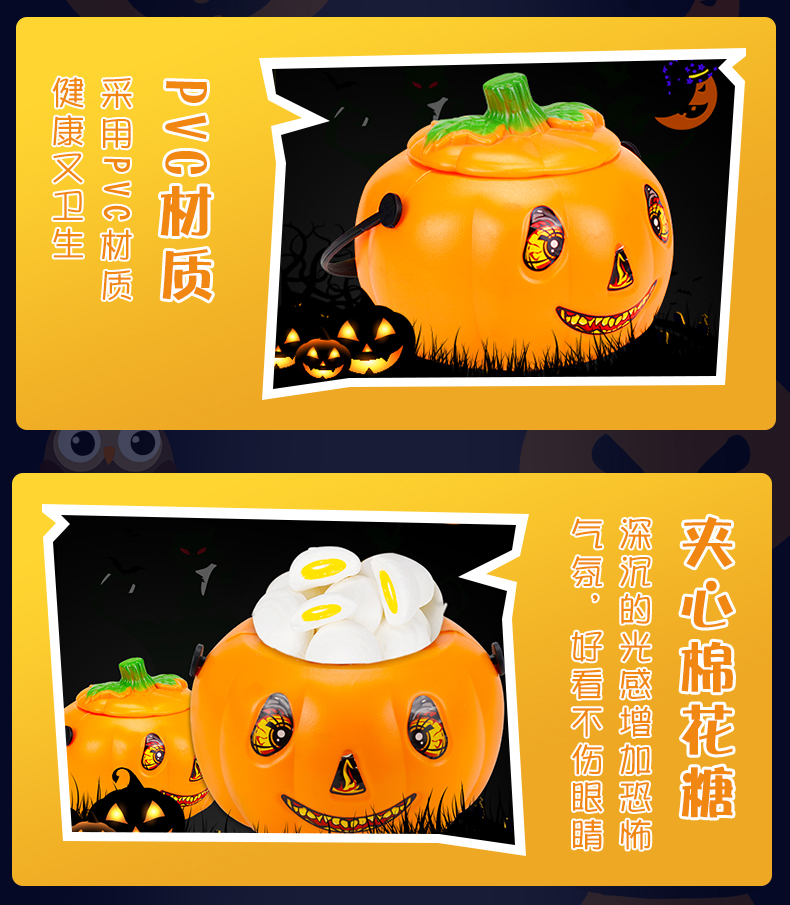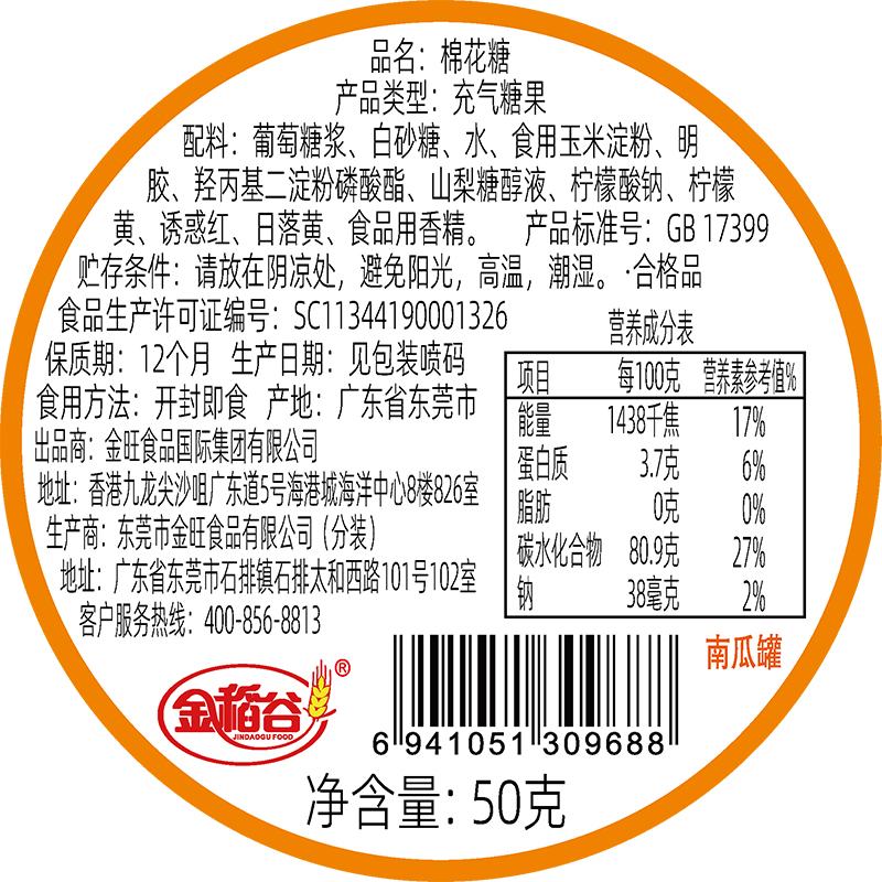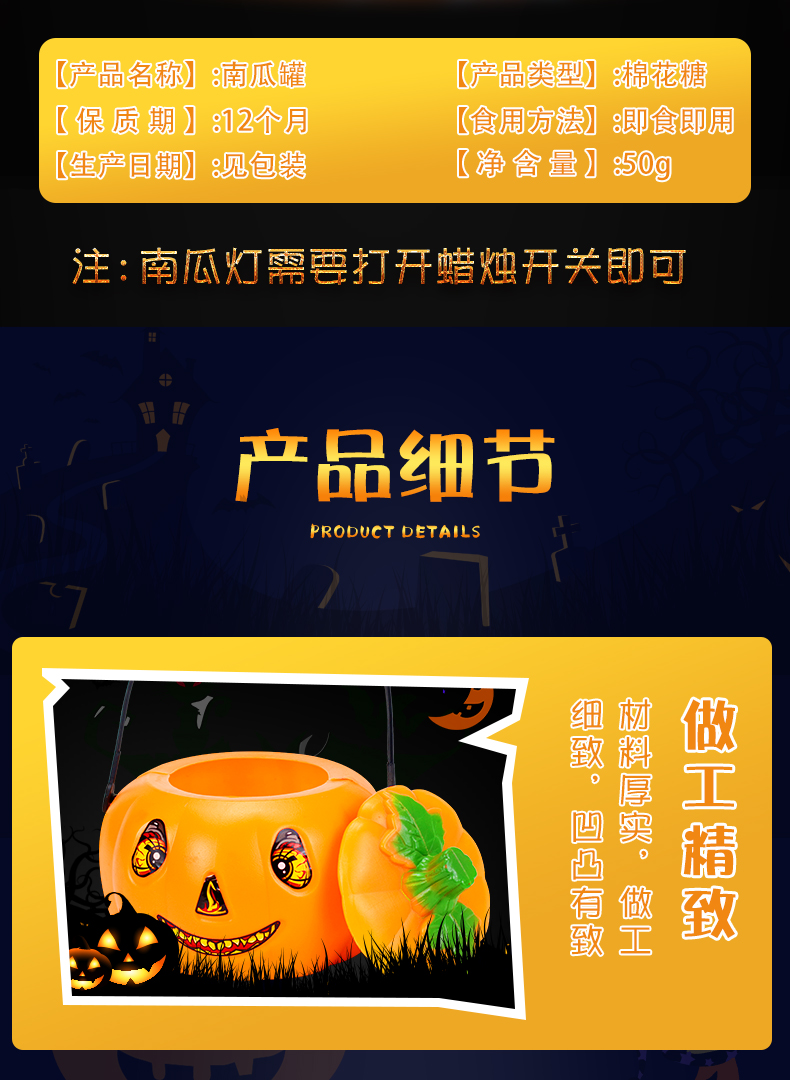【金稻谷 万圣节棉花糖儿童手提南瓜灯创意搞怪礼物鬼屋糖果罐】 南瓜桶棉花糖,50g,价格:12.90元。这款金稻谷南瓜桶棉花糖真的太可爱了!它不仅有着南瓜形状的桶身,还有着可爱的南瓜灯设计,让人一看就爱上。而且,它的口感也非常棒,棉花糖软糯可口,甜而不腻,让人吃后回味无穷。总之,这款金稻谷南瓜桶棉花糖是一款非常有趣的礼物,无论是送给朋友还是自己品尝都是非常不错的选择。