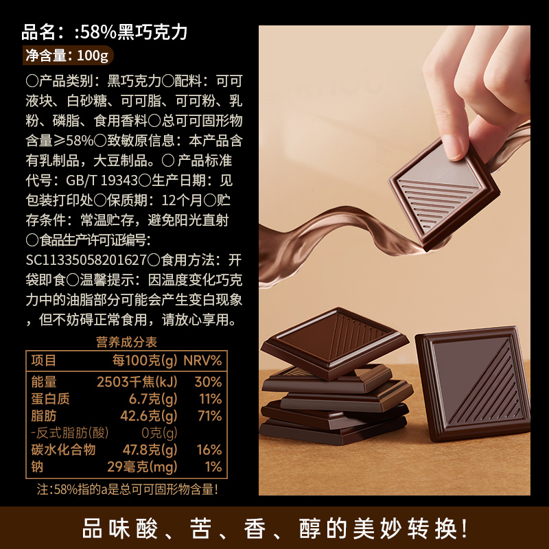 - ¥7.9058%黑巧【含糖甜苦适中】,100g*1盒【约25片】