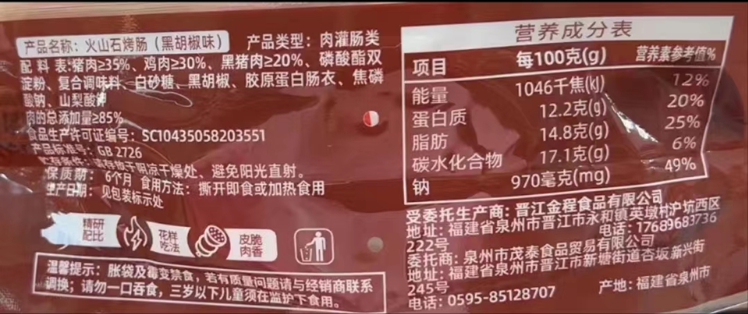 - ¥12.80 火山石烤肠黑胡椒味一袋(内含十根),200g