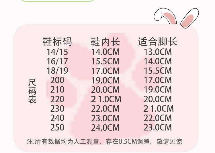 - ¥19.90 粉红色【拼色款】,22-23(内长14cm适合脚长13cm)
