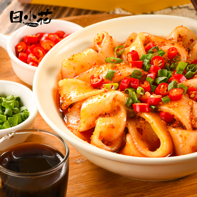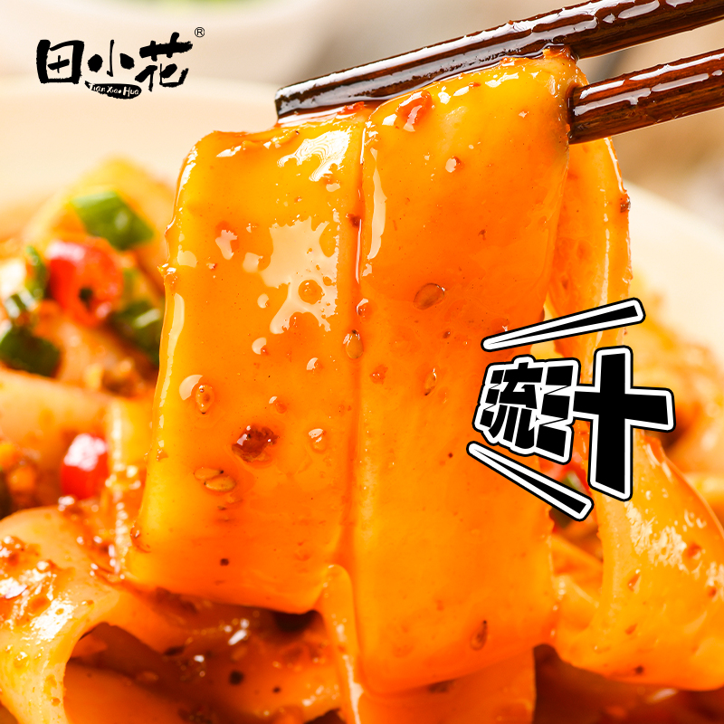 田小花流汁大宽粉,口味升级,麻酱和红油两种口味,浓郁酱汁包裹每一根宽粉,口感Q弹劲道,好吃到停不下来。