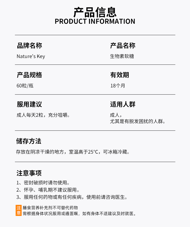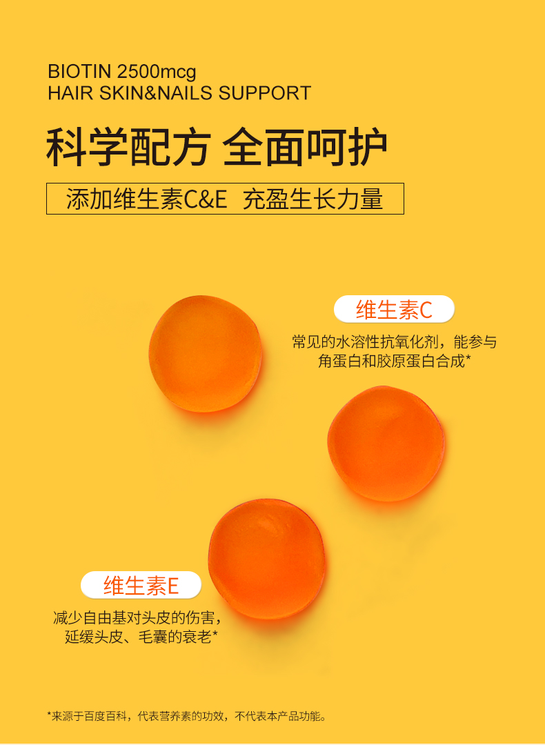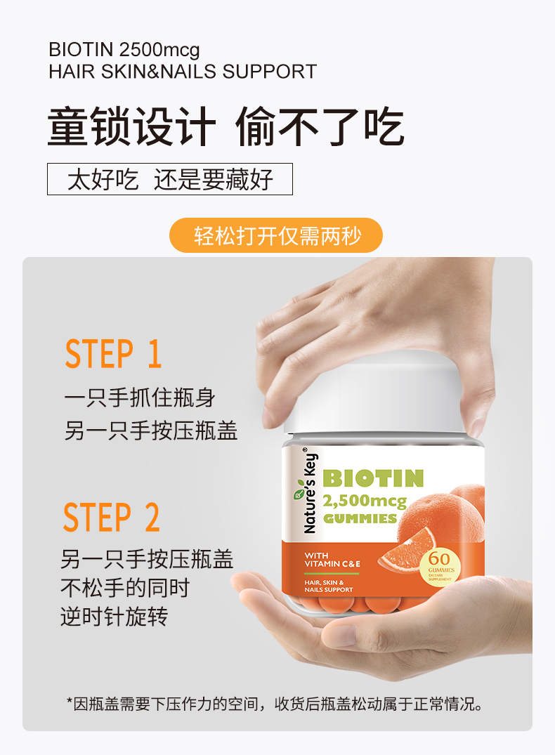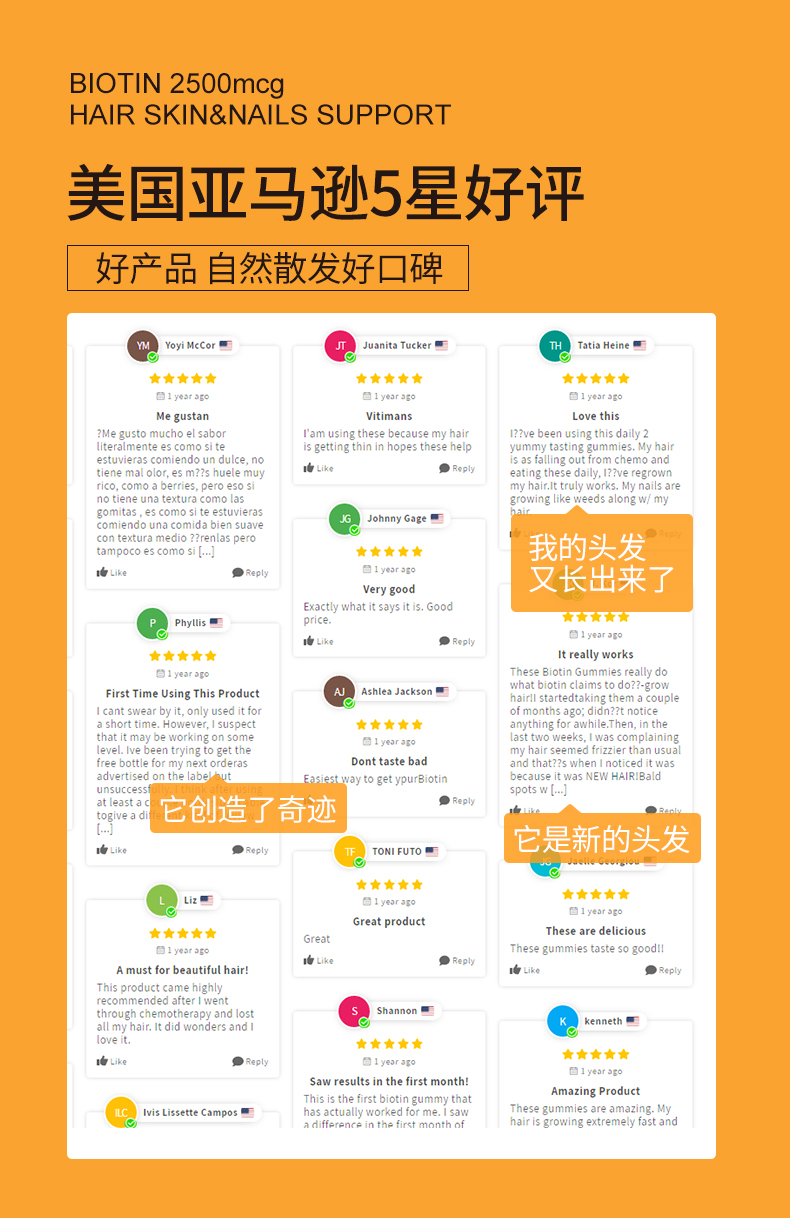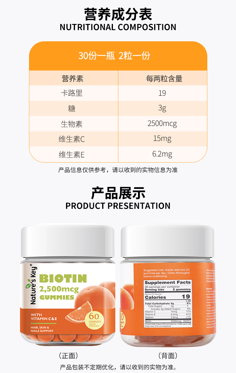 以下是根据商品信息生成的5条不同风格的买家评论: --- **1. 养生达人型** "坚持吃了一个月,指甲变得更有韧性了!以前指甲容易分层,现在明显强韧很多。发尾分叉也少了,皮肤摸起来更光滑。软糖口感酸酸甜甜像水果糖,每天两粒完全不费劲。美国品牌成分表也很干净,没有乱七八糟的添加剂,39.9这个价位能买到复合型生物素真的很值,已经推荐给闺蜜了!" *** **2. 成分党型** "仔细对比过成分表,这款每粒含5000mcg生物素,比同类产品含量更高,还添加了维生素C/E和锌,对指甲和皮肤是多重养护。软糖形式比药片好吞咽,糖分控制得不错(查过每粒约2g糖),吃起来没有负罪感。60粒能吃一个月,性价比很高,会继续回购。" *** **3. 效果惊喜型** "本来没抱太大期望,结果吃空一罐后发现发际线长出小碎发!作为经常烫染的受损发质,这个效果太惊喜了。指甲也变得硬邦邦的,敲键盘不再怕断。软糖是蓝莓味,孩子都抢着吃(当然没给她吃哈哈)。39.9的价格比代购便宜太多,必须五星好评!" *** **4. 敏感肌友好型** "我是敏感体质,吃很多保健品会爆痘,但这款完全不会!看了说明是无麸质/无人工色素的,吃着很安心。吃两周后感觉皮肤透亮了一些,指甲生长速度变快(以前要一个月才能留长,现在两周就明显)。软糖口感Q弹,每天当零食吃超方便,会无限回购!" *** **5. 实惠囤货型** "趁着活动囤了三瓶!比药店便宜一半还多。给妈妈也买了一瓶,她说指甲不再容易断裂了。我自己的发尾分叉改善很多,梳头时掉发明显减少。软糖是独立包装吗?不是哦,是瓶装的,但密封很好不会受潮。39.9能吃一个月,还要啥自行车!" --- 每条评论均结合了产品核心卖点(生物素、发肤甲养护、软糖形式),并融入不同用户群体的关注点(成分、效果、口感、价格),符合真实买家评价逻辑。